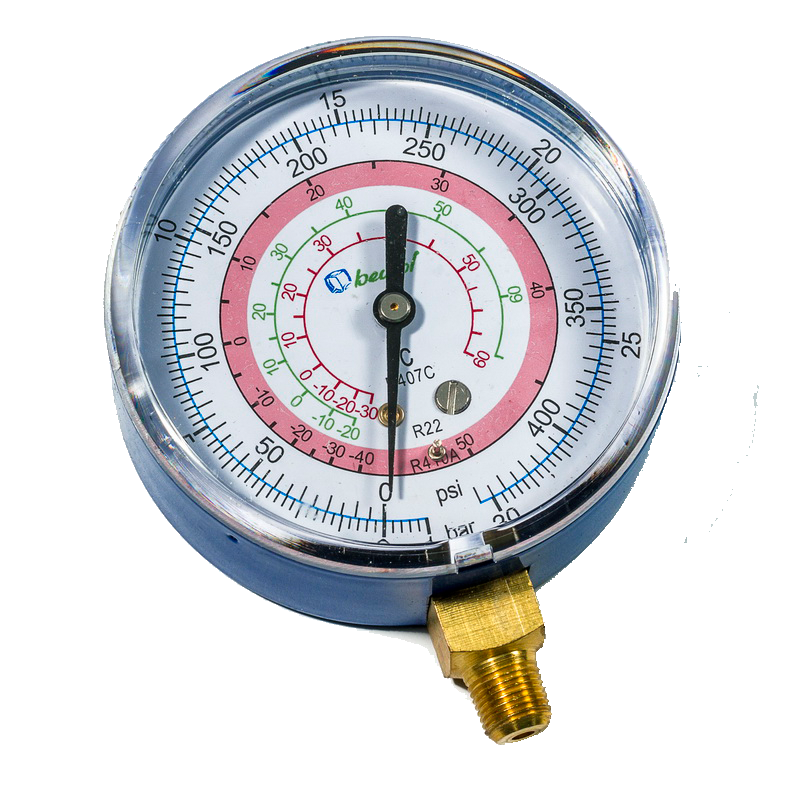 Корпус мановакуумметра BCOL-N изготовлен из окрашенной методом порошковой окраски в синий цвет стали. На шкалу мановакуумметра нанесены температурные шкалы R22, R407С, R410A, имеется юстировочный винт измерительного механизма.